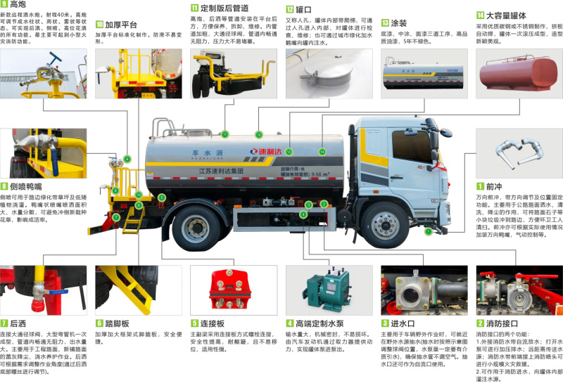 ● 采用專用定制版大功率水泵,具有性能優良、工作可靠、效率高、流量大、等特點,前沖可達雙向8車道,后灑可達雙向4車道,高炮最大可達40米射程。